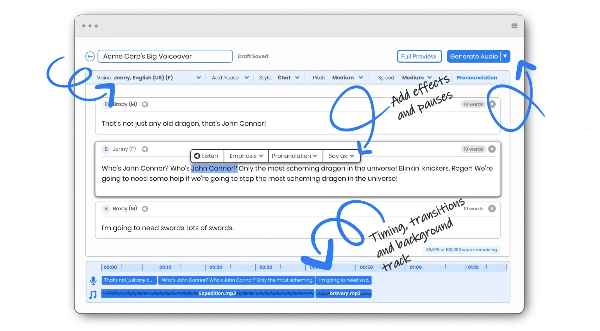 Generate lifelike text to speech (TTS) audio using our AI voice generator with studio like editing features. Manage it all from one place with unlimited previewing, exporting, hosting and streaming